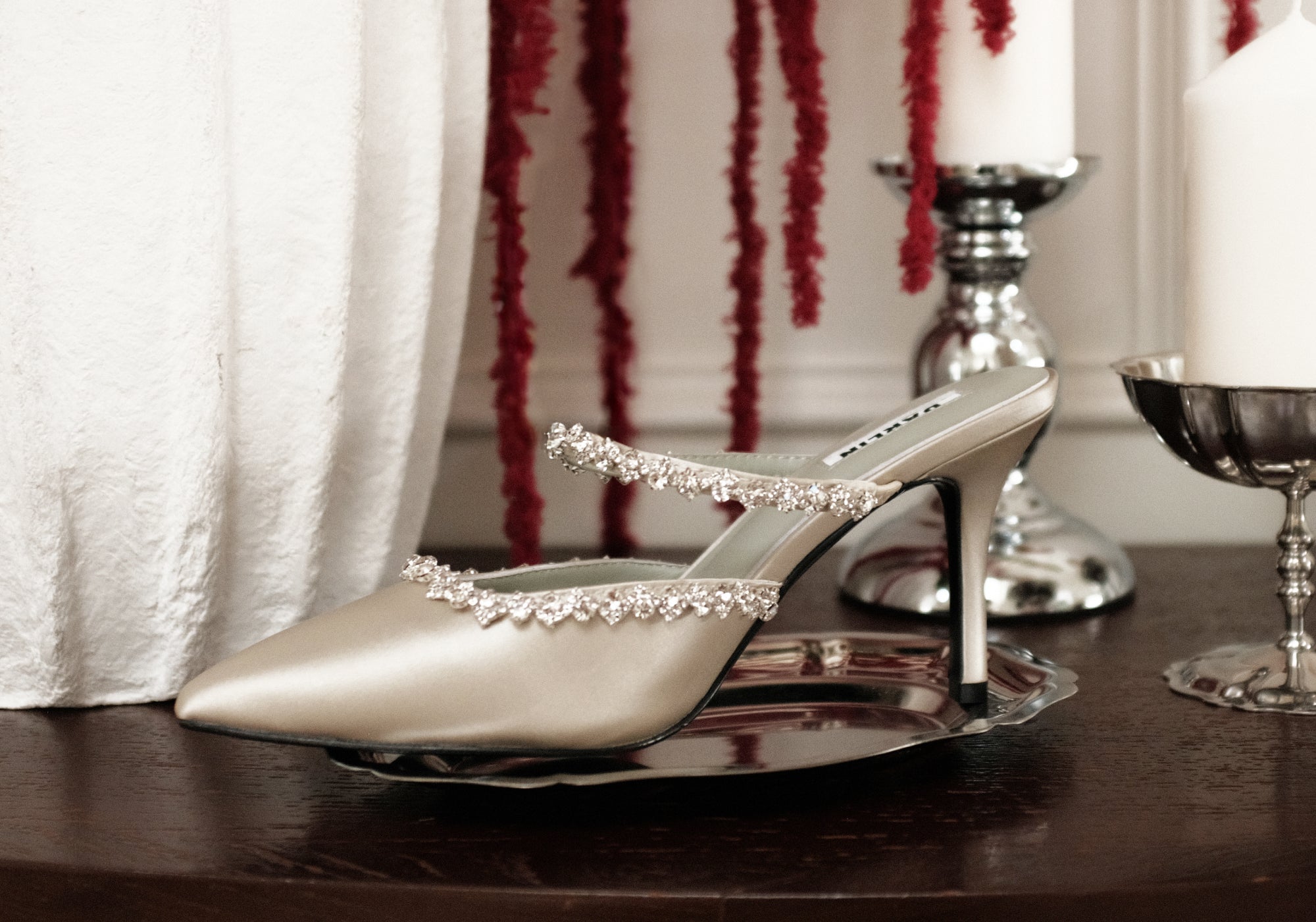 ดีไซน์หัวแหลมช่วยให้เท้าดูเรียว เสริมเสน่ห์ด้วยดีเทลเส้นเพชรระยิบระยับบริเวณหน้าเท้า และสายคาดช่วยคอมพลีทลุค และเพิ่มมิติให้รองเท้าดูโดดเด่นขึ้น